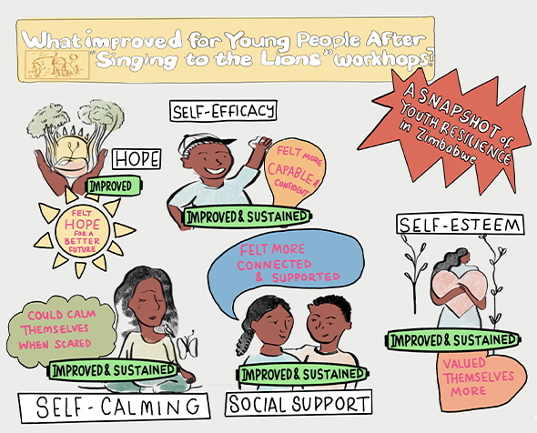 Participants included over 1,300 youth in urban and rural settings who answered questions about their characteristics, symptoms associated with trauma, and indicators of resilience. Youth answered questions before attending an STL workshop at school, immediately after the workshop and three months later. Parents and caregivers also took part in the study through a participatory method called Most Significant Change. Through qualitative interviews, parents and caregivers told stories about changes they had observed in their children after the STL workshops, then these stories were analyzed by a group of local teachers who selected the stories they determined were most significant through a local community lens. Also in the study’s qualitative phase, a subsample of children were asked to draw a picture of themselves along with people, places or things that help them to “sing to their lions” (that is, face their fears) followed by a brief interview. Drawings were then analyzed by a bilingual local team to identify key intervention impacts from children’s perspective.